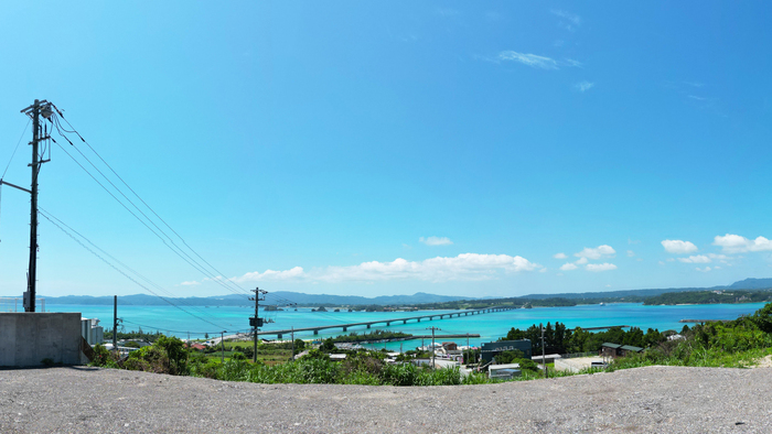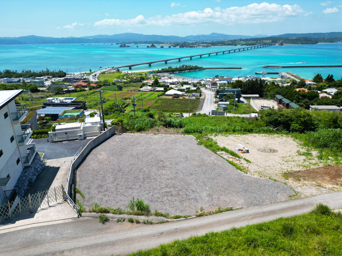 次に、新着物件(借地)をご紹介します。その場所は、美しい自然に囲まれた古宇利島。面積は約150坪と広々としており、古宇利大橋の壮大な景色と、エメラルドグリーンの海を見渡すことができます。