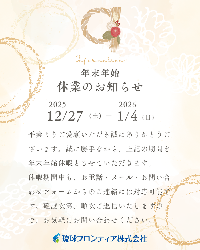 平素よりご愛顧いただき、誠にありがとうございます。誠に勝手ながら、下記期間を年末年始休暇とさせていただきます。【休暇期間】12月27日(土)〜 1月4日(日)休暇期間中も、お電話・メール・お問い合わせフォームからのご連絡には対応可能です。確認次第、順次ご返信いたします。本年もたくさんのお問い合わせ・ご縁をいただき、心より感謝申し上げます。皆さま、どうぞ良い年をお迎えください。来年もよろしくお願いいたします。
